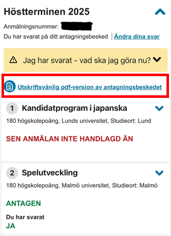 På www.antagning.se kommer du få upp ett alternativ att ladda ner ditt antagningsbesked, se bild nedan.