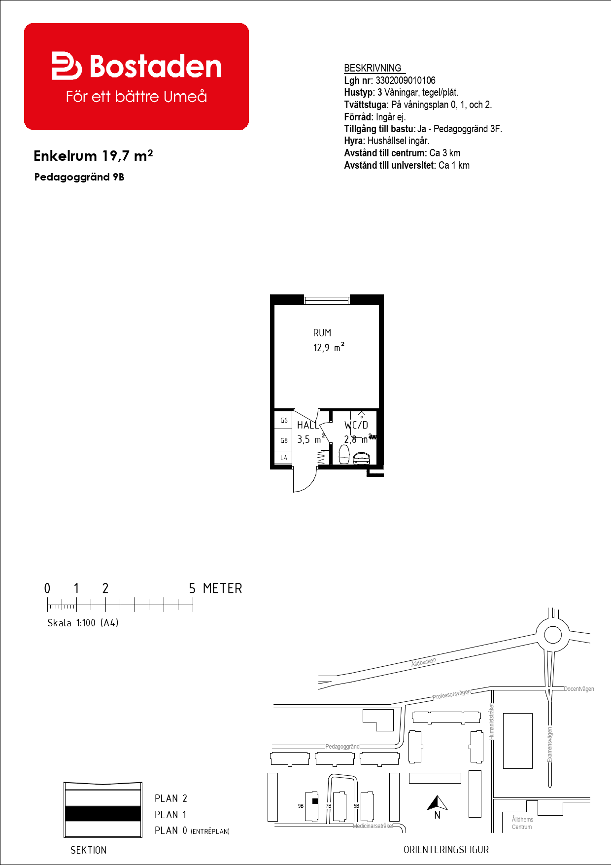 Avstånd till centrum/universitetet:Ca: 3 km / 1 km